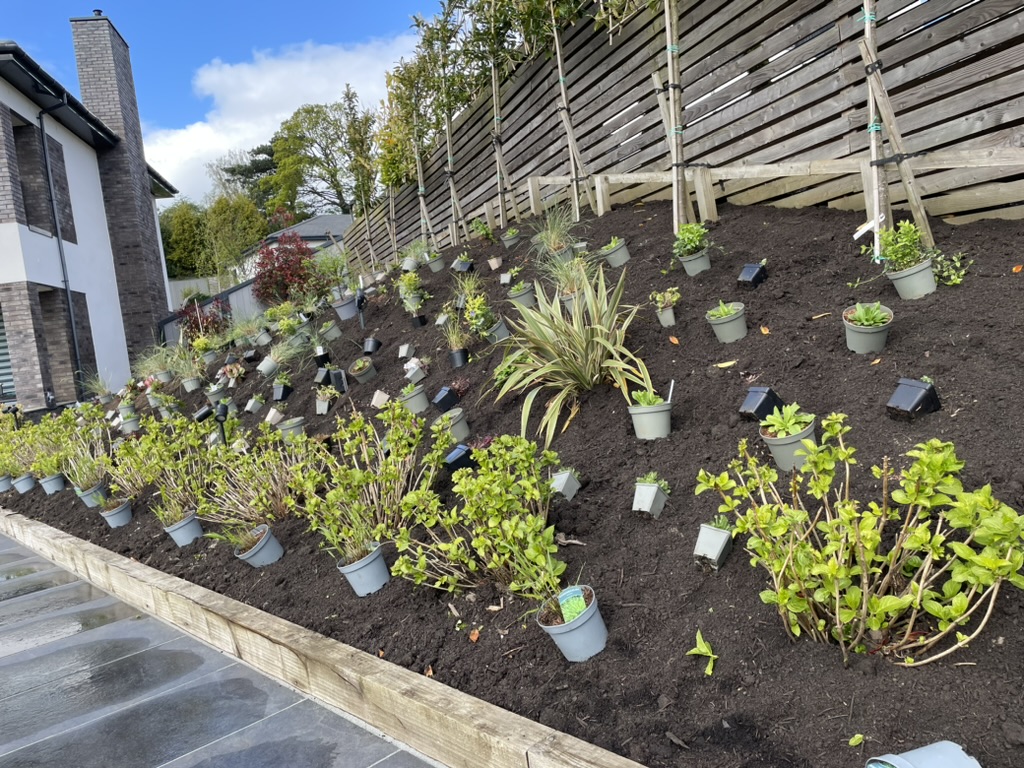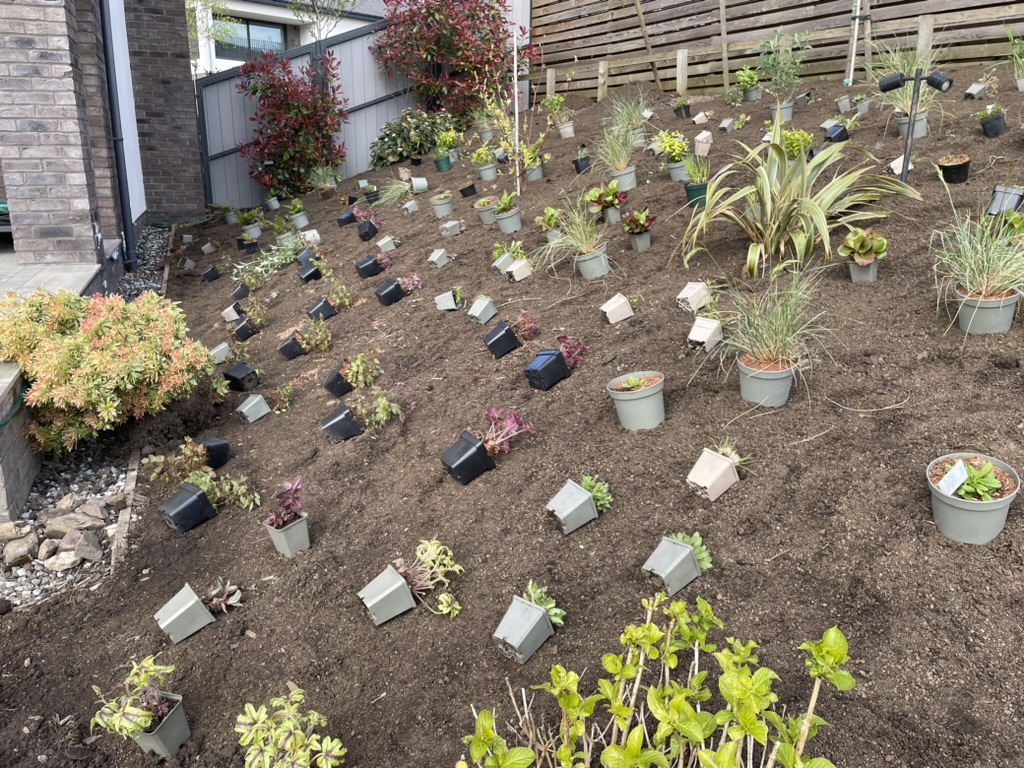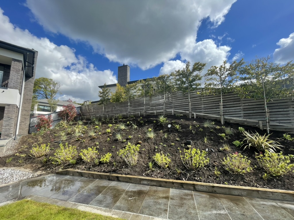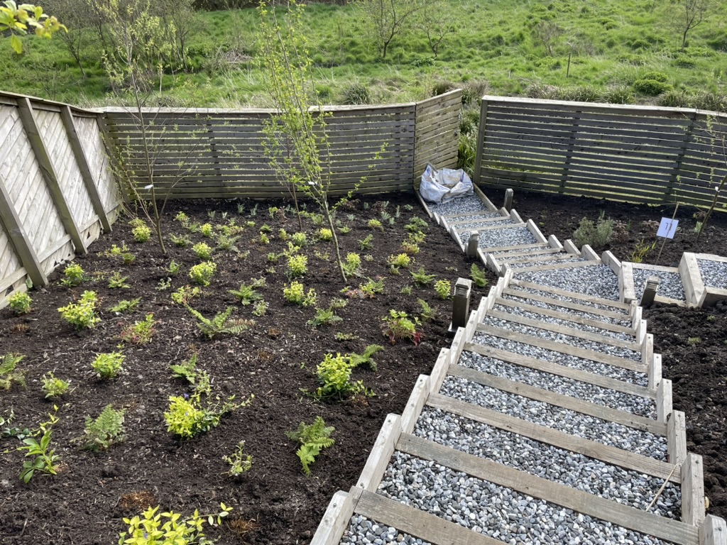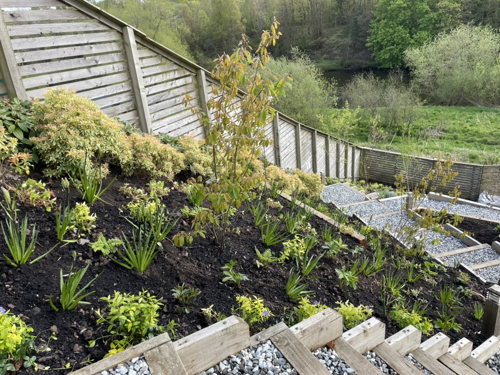 This was a large planting project for a newly constructed garden. I approached the project by designing a naturalistic planting scheme for the majority of the planting areas. A large amount of existing viburnums and pieris were moved to the boundaries to create a double evergreen frame rather than removing them. It was a challenge with over 2000 plants to design, source and plant in this sun-soaked riverside garden. The garden is now starting to fill out and the layers are becoming more obvious, from the beautiful himalayan birches, amelanchiers and hawthorns, through the shrub layer and into the ground cover matrix, determined by the position and elevation of the planting beds within the garden which was dry at the top and moist at the lower levels.