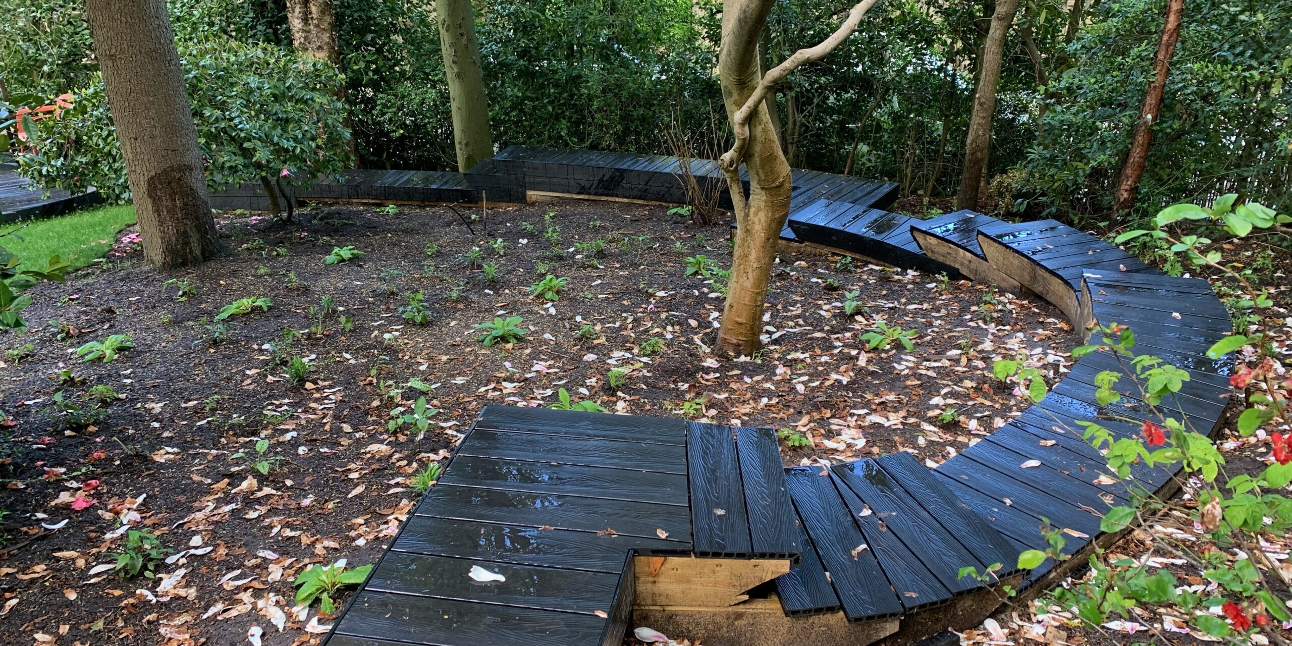 This unusual woodland garden is a little bit of magic hidden away in an urban setting. The slippery slopes of the garden are now navigated via a boardwalk which encircles the main planting area. A glade of woodland plants has been planted in a matrix style. The boardwalk leads to a deck which is positioned for evening sun and is an entertainment space. The pergola at the top level of the garden provides feature seating area with a structural planting of ferns, grasses and woodland Hydrangea providing a cosy setting. The upper lawn is raised by an invisible timber retaining wall, creating an ‘infinity lawn’. The garden storage unit it disguised with a green roof for added interest. I am looking forward to re-visiting this newly planted garden in 2022 to see how the planting has developed.